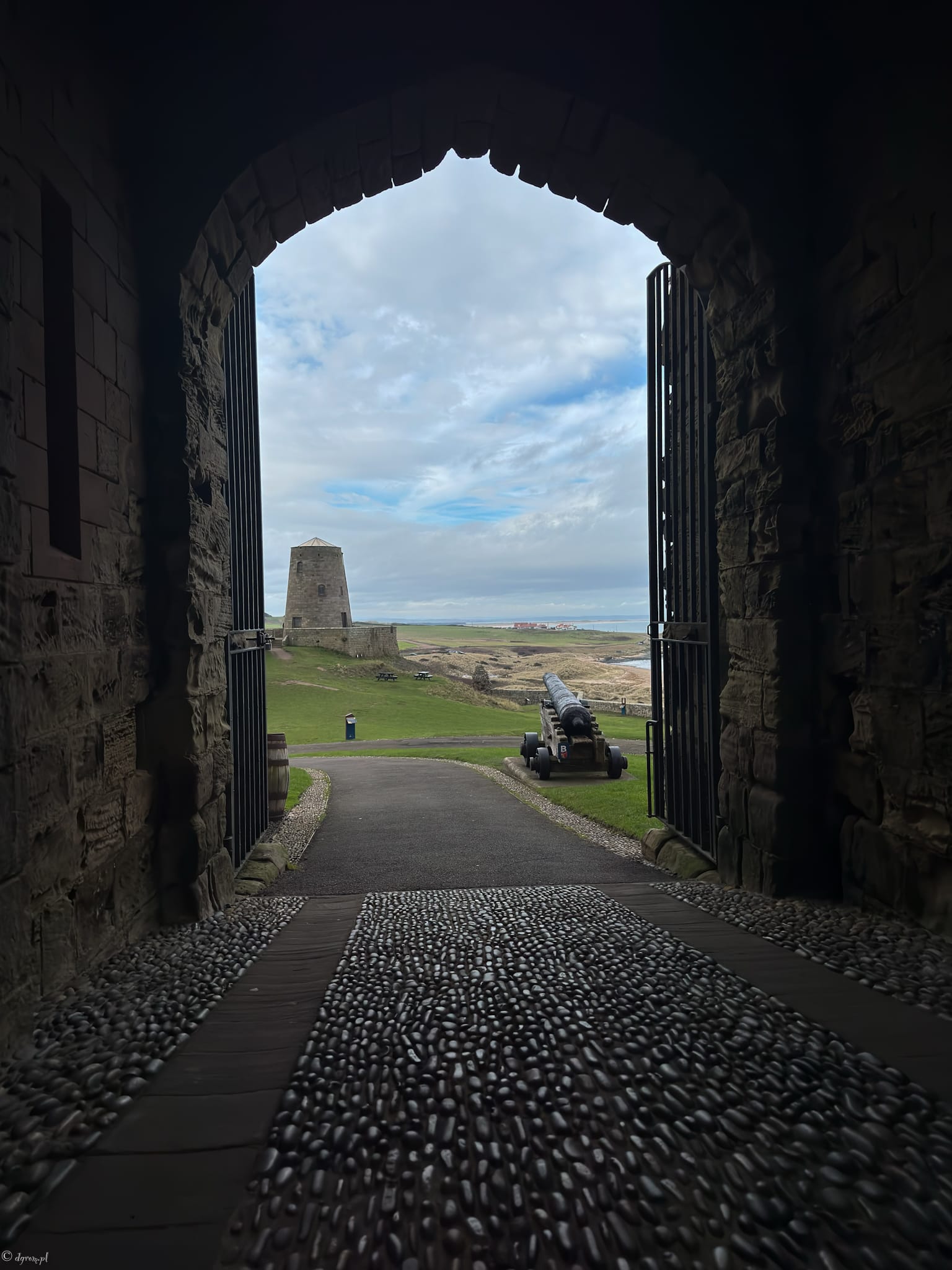 Po nocce spędzonej w Berwick-upon-Tweed ruszyliśmy rano na pierwszy zamek tego dnia: Bamburgh Castle. Już z daleka robi ogromne wrażenie — stoi na potężnej bazaltowej skale i wygląda tak, jakby ktoś zaprojektował idealną warownię do filmu. Monumentalny, dumny i widoczny z wielu kilometrów, bez problemu dominuje nad całym wybrzeżem.