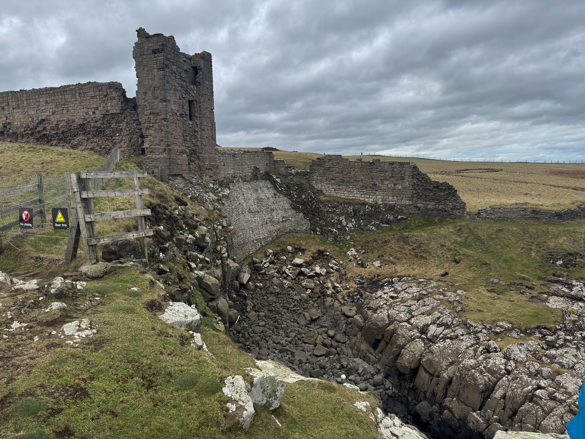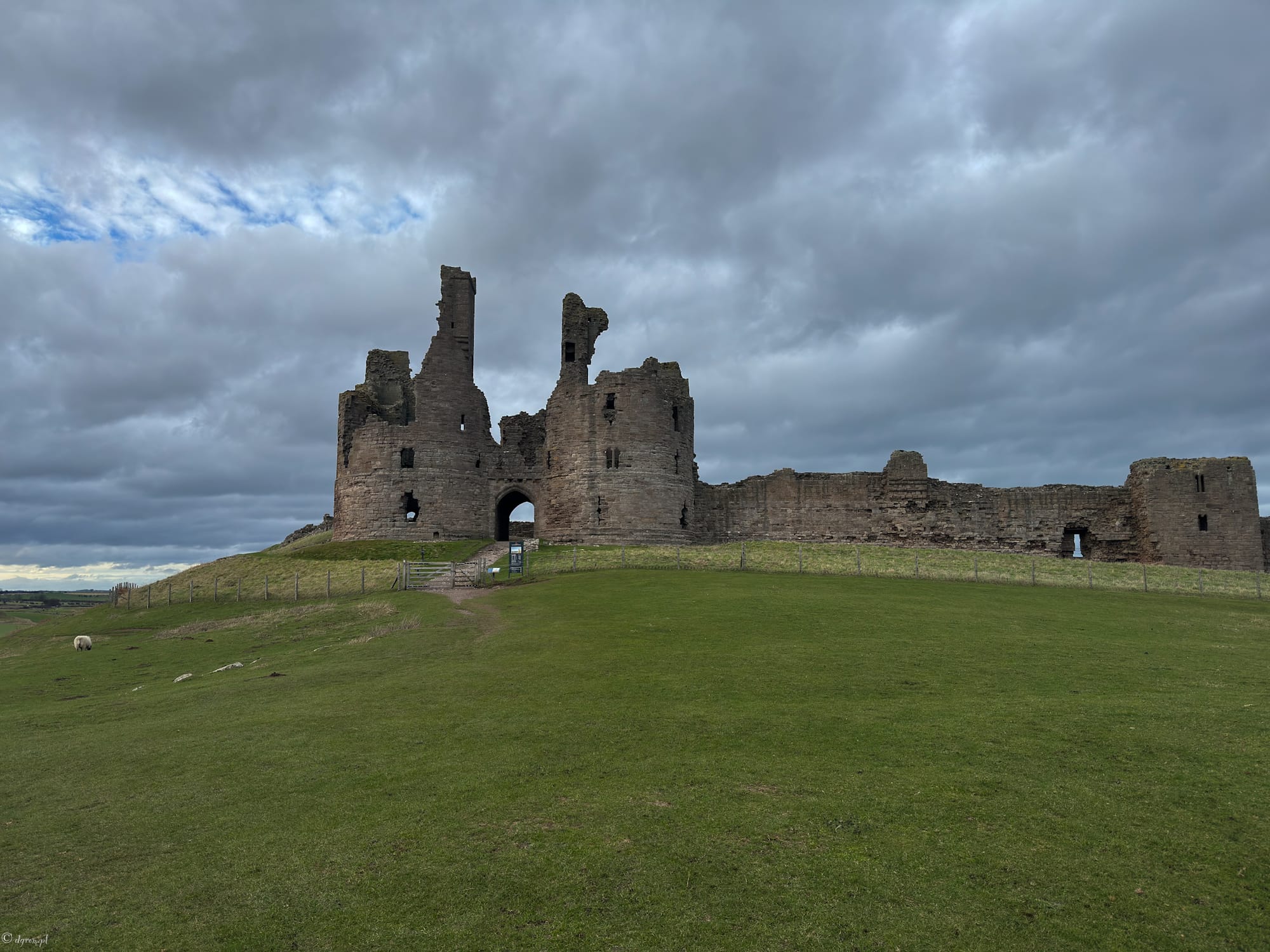 Drugim zamkiem tego dnia był Dunstanburgh Castle. Dojechaliśmy do rybackiej wioski Craster, a stamtąd ruszyliśmy pieszo — około 2 km wzdłuż wybrzeża. Chociaż jedna osoba z naszej ekipy twierdzili ,ze to 20 km 😄. I właśnie ten spacer robi połowę klimatu, bo Dunstanburgh nie pojawia się od razu. Najpierw jest morze, wiatr, trawa uginająca się pod podmuchami, a potem nagle na horyzoncie wyrastają samotne ruiny uczepione klifu.